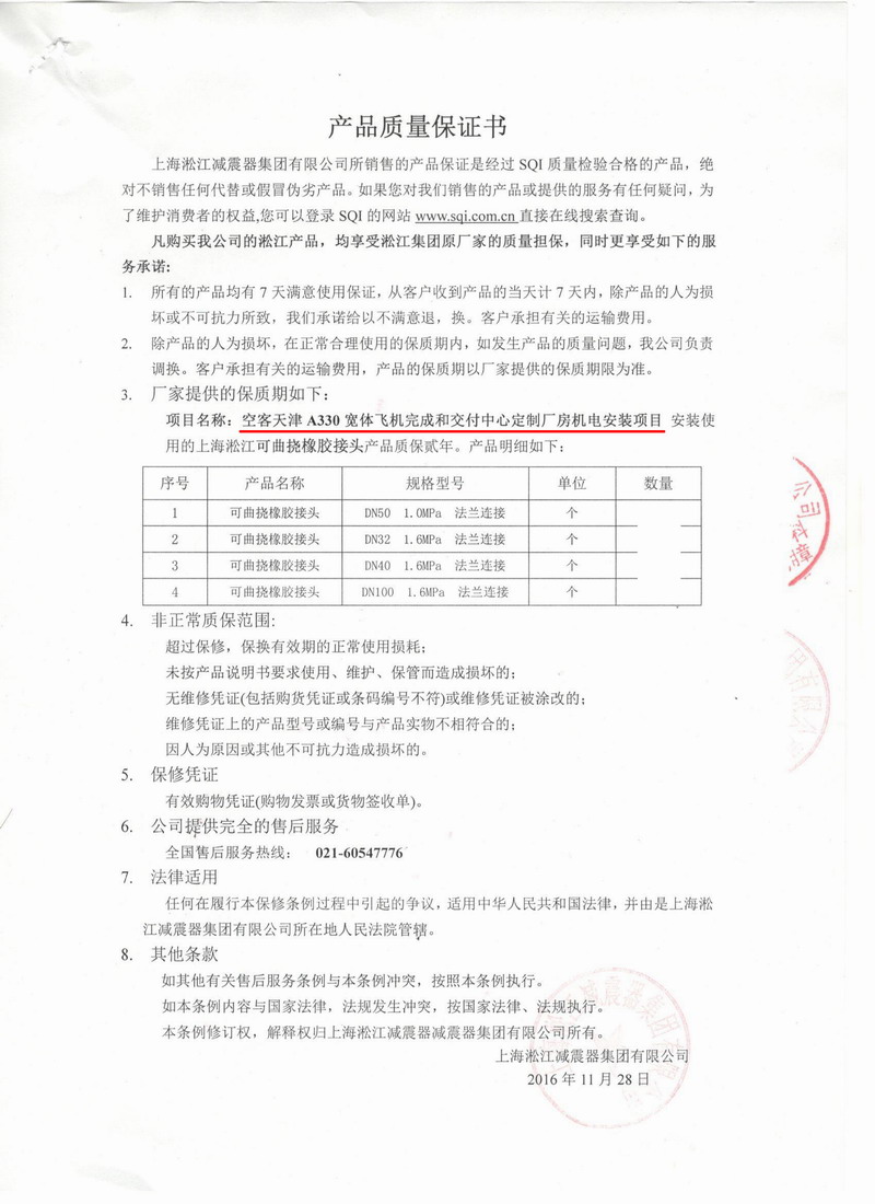 淞江集團為本次項目提供的可曲撓橡膠軟接頭口徑為:DN50、DN32、DN40、DN100;空客天津A330寬體飛機完成和交付中心定制廠房機電安裝項目使用,壓力16公斤,法蘭連接,冷水用的,淞江集團為國內眾多航空項目提供橡膠軟接頭產品。
