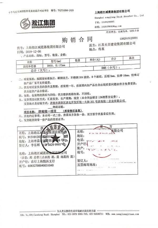 上海淞江減震器集團有限公司介紹:濟南統一企業波紋補償器項目合同信息,淞江集團為國內眾多飲料企業提供飲用水級管道減震器產品,以下是為濟南統一提供波紋補償器產品。