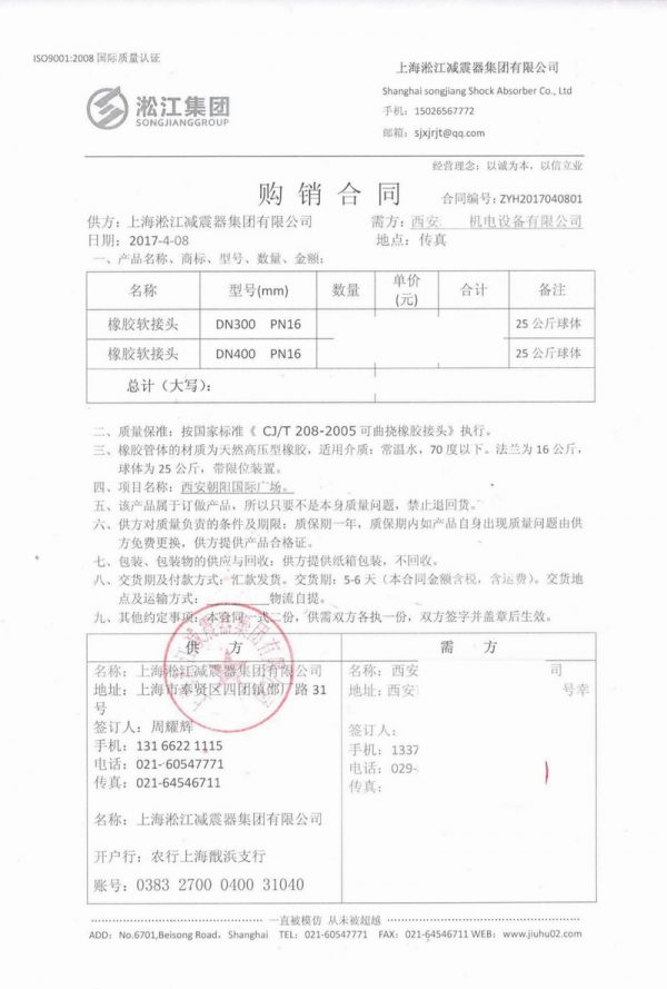 上海淞江減震器集團有限公司網站為您介紹:西安朝陽國際廣場項目25kg橡膠軟連接合同信息,淞江集團為各大廣場項目配套高壓橡膠接頭產品,以下是為西安朝陽國際廣場項目配套的25kg橡膠接頭合同介紹。
